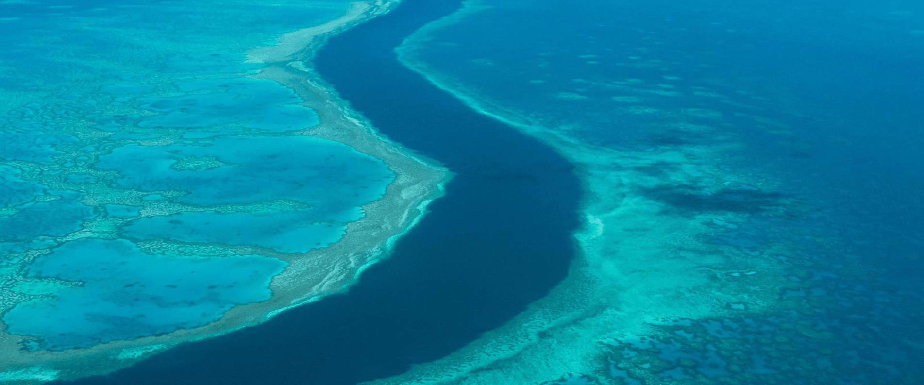 The narrow blue channels that separate the reef systems indicate super-deep water. The darker the blue of the water, the more nutrients the water has. These nutrients feed the reef, but there are no corals in the deep blue due to a lack of light (corals rely on light to photosynthesise, just like any plant).